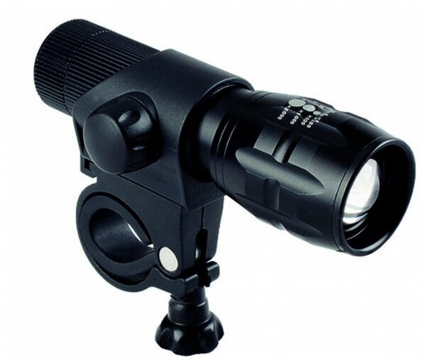Светодиодная, с функцией зуммирования, герметичный алюминиевый корпус, 1 белый диод повышенной яркости CREE 3Вт, 3 функции, с батареями, черная, крепление на руль без инструмента, блистер.
