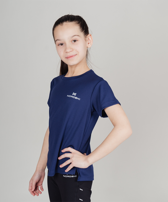 Беговая футболка свободного кроя. Выполнена из «дышащей» ткани, тянется в 4 стороны. Материал быстро впитывает испарения с тела и отводит их наружу. По бокам разрезы, задняя часть футболки удлинена. Круглая горловина. Плоские швы. Втачной рукав. Однотонный дизайн позволяет комбинировать футболку с любыми изделиями.