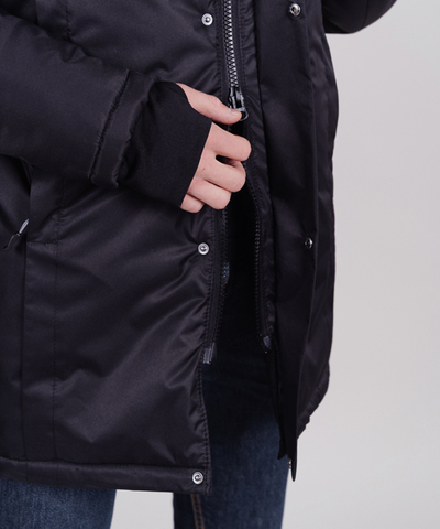 Парка имеет ветрозащитную планку на молнии ,утепленный цельнокройный капюшон, что обеспечивает комфорт в ветреную погоду. На рукавах манжеты с вырезом под большой палец. Боковые карманы на молнии, а также внутренний карман для хранения необходимых вещей.
