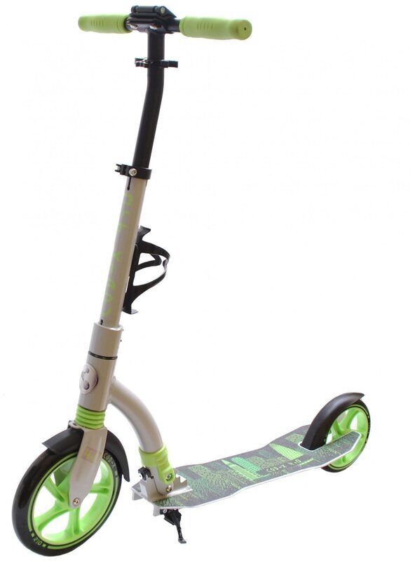 Серебристо-зеленый, алюминиевый, новый широкий руль с углом подъема, фиксируемый 2-мя эксцентриками, регулируемая высота руля, резиновые ручки, оригинальный дизайн, передний амортизатор, нагрузка до 100кг, ножной тормоз, колеса перед 230мм, зад 180мм с герметичными подшипниками ABEC-9, ремень для переноски, флягодержатель, вес 4,8кг, индивидуальная упаковка.