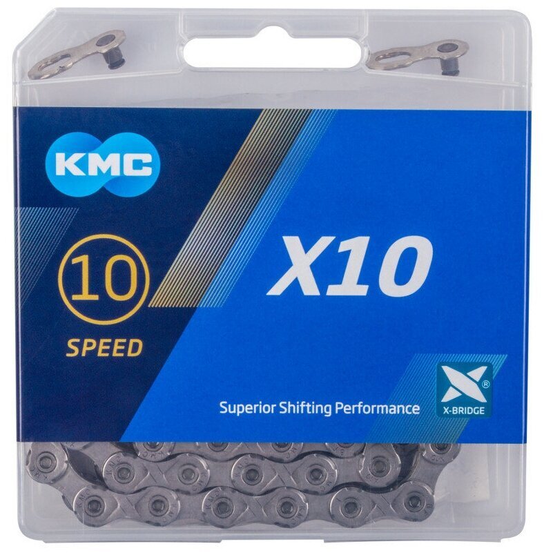 Цепь KMC X-10 10 скоростей 5-303572 (5-300868) для 10 скоростных трансмиссий, с соединительным замком, в пластиковой коробке. Подходит для Shimano, Campagnolo, Sram и других